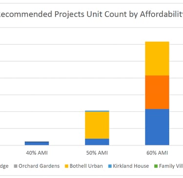 The image below shows the “affordability level” of each proposed project. “AMI” is Area (king county) median income.