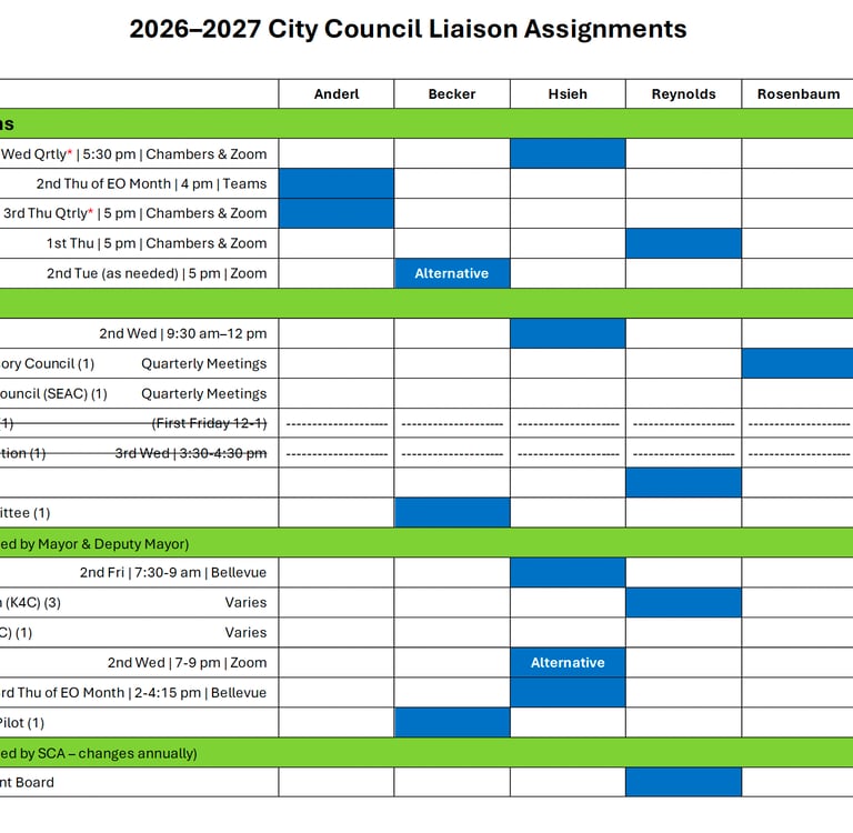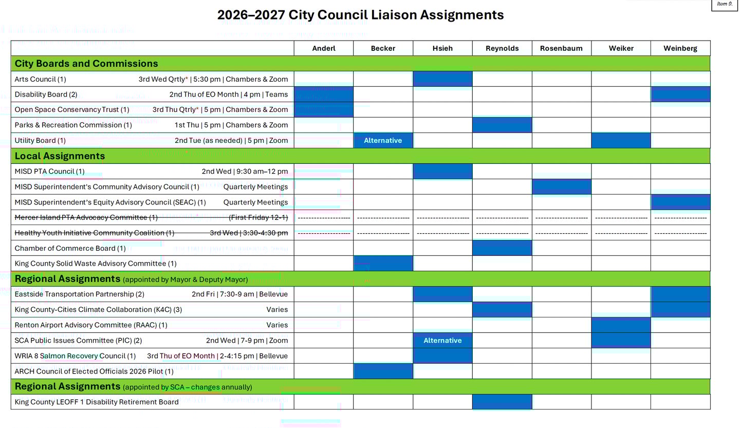 The purpose of this agenda bill was to alert the Council to the liaison appointments made by the Mayor for 2026-2027. I was very pleased with the assignments I was given.