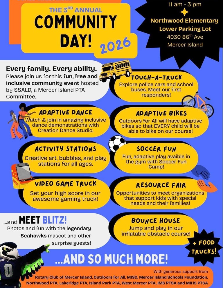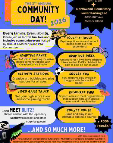 This year, Community Day is back for our third year! This year will be bigger, better, and more joyful than ever. We'll have a giant video game truck, two bounce houses, food trucks, soccer fun, adaptive dance, adaptive bicycles from Outdoors for All, MIPD police vehicles, school buses, a bubble station, and more. Families from across the region are welcome. And thanks to generous continued sponsorship and support from each island PTA, Rotary, and MISF, this is a free event for families.