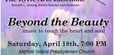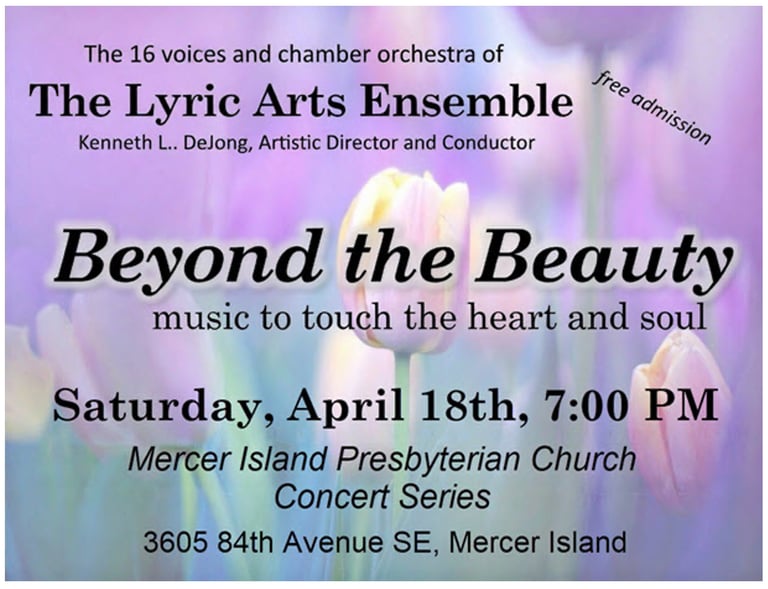 The Lyric Arts Ensemble, with its 16 voices and chamber orchestra, presents “Beyond the Beauty, music to touch the heart and soul” on Saturday, April 18th at 7:00 PM at Mercer Island Presbyterian Church.