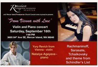 The Russian Chamber Music Foundation of Seattle was founded in 2007 by Mercer Island resident Dr. Natalya Ageyeva, who serves as Artistic Director. She and Foundation Board member Allan Park are instrumental in bringing the Grand Prix concert to the Mercer Island community and the greater Eastside.