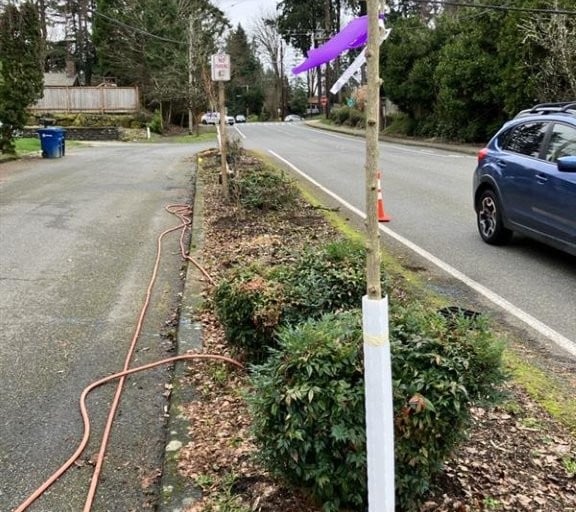 Urban forestry contractors are currently planting 12 trees and 115 shrubs and groundcover plants in the planter strip on the 3700 block of 78th Ave SE. Staff recently removed several declining pear trees from this strip to make space for these landscape improvements.